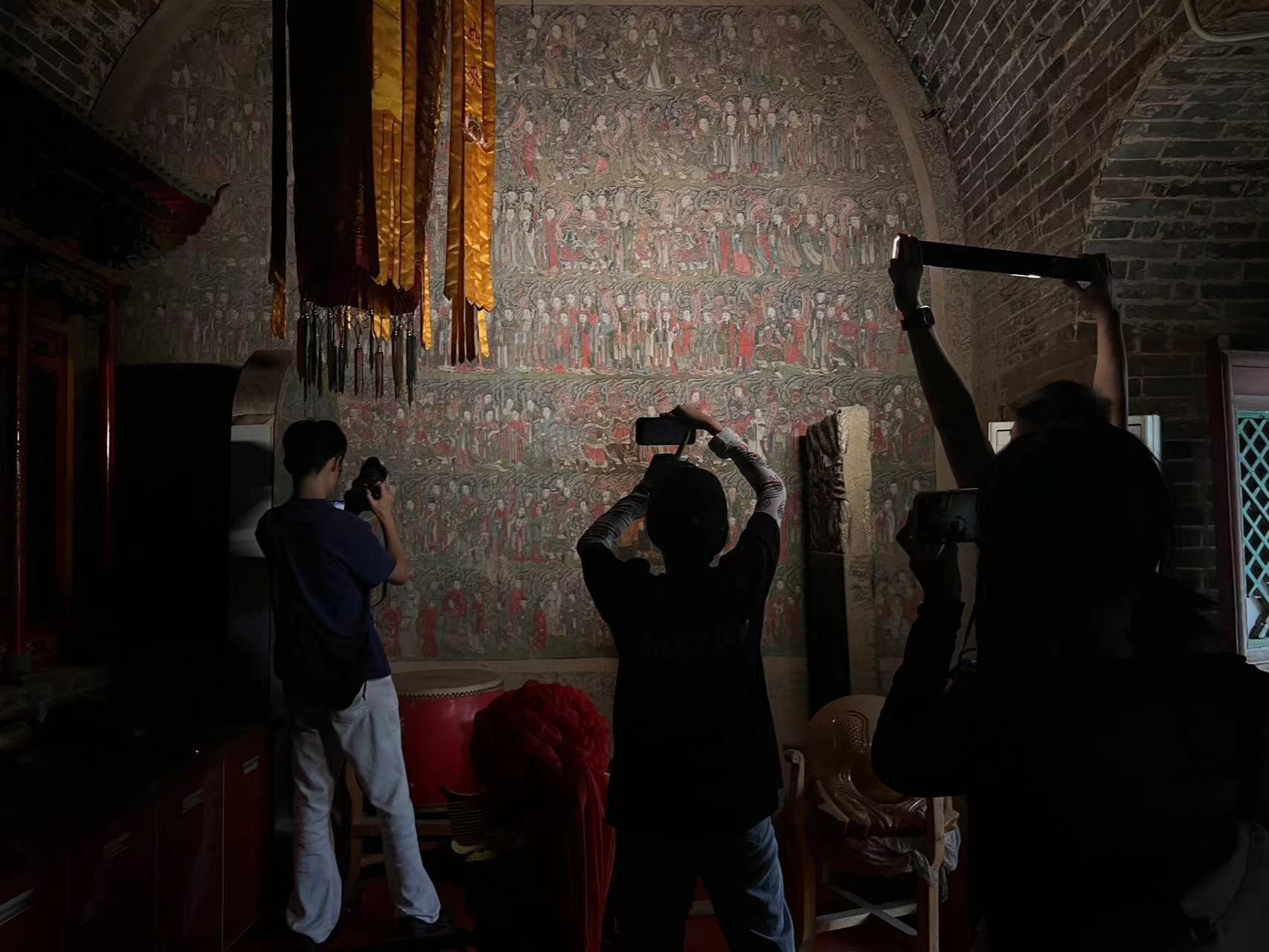 在悬空寺等处,地形崎岖,山势陡峭,部分区域甚至需要攀爬和绳降才能接近,给团队带来了不小的挑战。大家克服重重困难,利用摄影、三维扫描等技术对内部壁画进行了全方位的采集和记录,为后续的数字化保护工作积累了大量素材。团队队长、91av 2023级广播电视专业硕士研究生杜英捷说:“我很荣幸能够在传统文化遗产和现代数字化技术的交融中为榆林壁画艺术的保护出一份力,脚上沾满黄土,让我对文化遗产保护有了更深的敬意,我深感责任与荣耀并存。团队的努力和成果,让我收获了宝贵的经验与成长,也更加坚定了我们为保护和传承传统文化贡献力量的决心。”