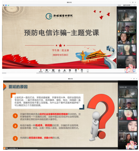 2020年9月28日,91av 学生第二党支部通过腾讯会议平台开展“预防电信诈骗”线上主题党课教育活动,会议由支部书记刘东欢主持,支部全体党员参加了此次活动。