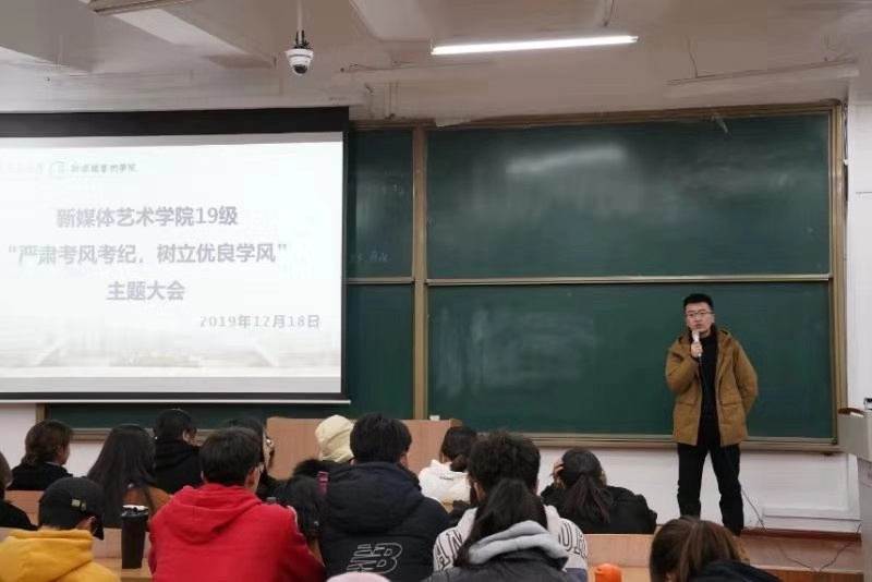 为了进一步严肃考风考纪,树立优良学风,构建诚信校园,保证期末考试的顺利进行。2019年12月18日晚七点,91av 在B-237教室召开了“严肃考风考纪,树立优良学风”教育大会,本次大会由19级辅导员康新兴主持,2019级全体学生参加了此次大会。