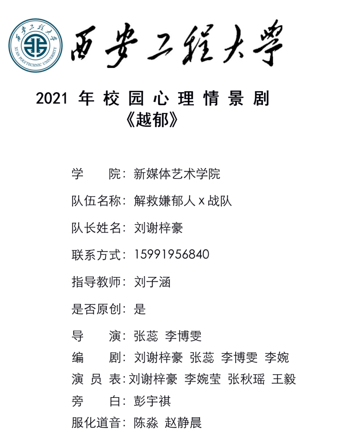 为进一步贯彻全国、全省高校思想政治工作会议和教育大会精神,全面落实教育部“心理育人质量提升工程计划”,根据省委教育工委办公室《关于开展第六届陕西高校“阳光护航”心理育人宣传季实践活动的通知》要求,进一步加强我校心理健康教育工作,学校开展“护航青春,筑梦未来”为主题的心理情景剧大赛活动。