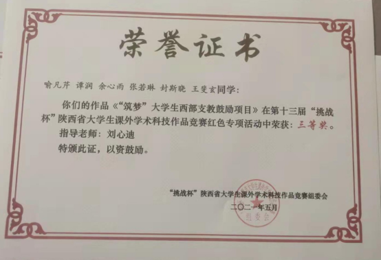 在我校入围的14件作品中,91av 作品《“筑梦”大学生西部支教鼓励项目》荣获红色专项赛道三等奖。该项目由2019级编导2班喻凡芹同学负责,刘心迪老师指导,团队成员包括2019级2班的封斯晓、张若琳、余心雨、谭润、王斐玄5位同学。团队从公益性质出发,着眼于当代大学生群体中所形成的“支教热潮”,从而产生了有无偿补贴、严格筛选教师资源、网络平台认证、入出帐记录公开透明等多项创新功能的基金会。