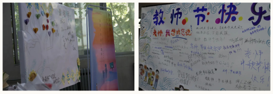 学院学生会的工作人员早早就来到学院楼,路过的同学们纷纷在展板上写下了对老师美好的祝福,并由学院学生会代表四大组织,分别向老师送去贺卡,及美好的祝福。