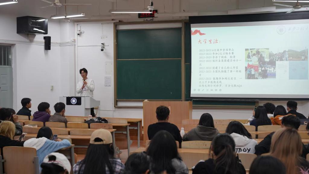 大学生活丰富多彩,课外该”怎么玩?“是郭榜程同学分享的第二个要点。郭榜程同学多次的徒步登山、参与公路车赛、学习网球滑轮的经历;假期外出实习、参与下乡的实践;组织各类团建活动、创建工作室的经验,让他对大学的课外时间该如何利用有了深刻的了解。会上他从体育锻炼、社会实践、技能提升三方面出发,提倡同学们以积极饱满的精神状态和优秀的身体素质、以奉献自我服务社会的人文精神、以精益求精不断提升的奋进品质”玩“遍大学生活,将青年人红日初升般的蓬勃朝气放飞蓝天。