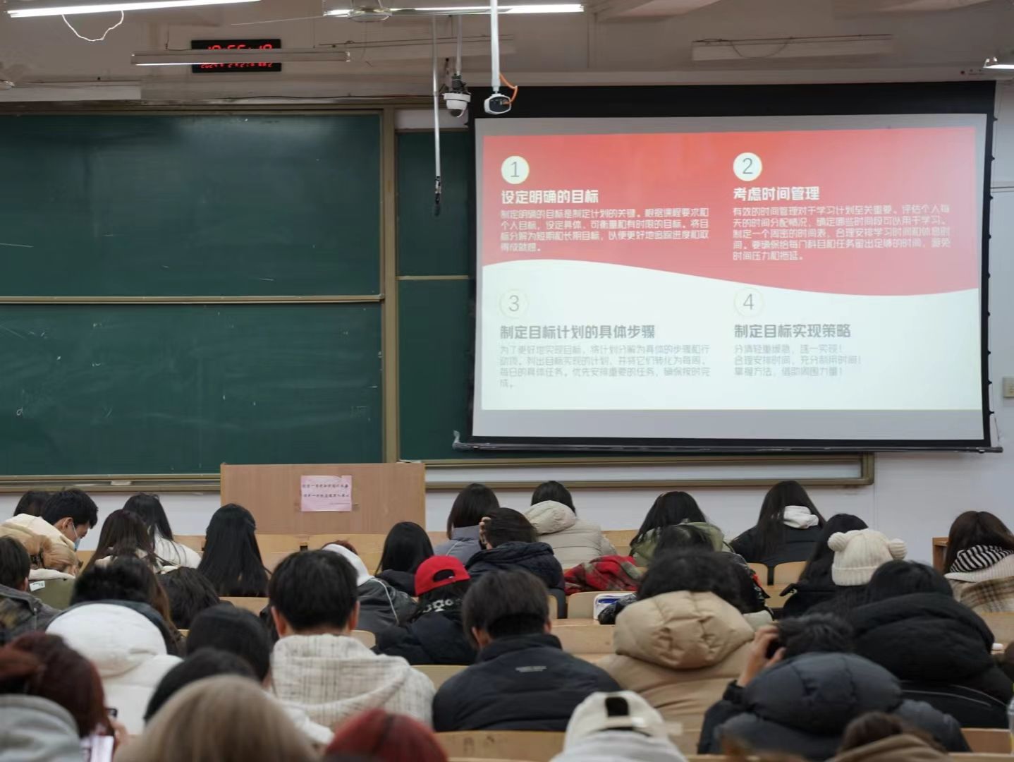 会议伊始,宾田田老师以新上映的电影《热辣滚烫》为引言,带领同学们回顾了假期生活。从假期模式切换到学习模式是同学们开启新征程的第一关,针对如何集中精力、调整状态,宾田田老师给出三点小建议:第一、调节生物钟。健康作息、适当锻炼,拒绝做脆皮大学生。第二、复盘总结,告别假期。总结收获,分析遗憾并思考以后应当如何避免。第三、调试情绪,缓解焦虑。接纳正常的负面情绪,尝试用“SWTC”情绪调节法缓解不良情绪。