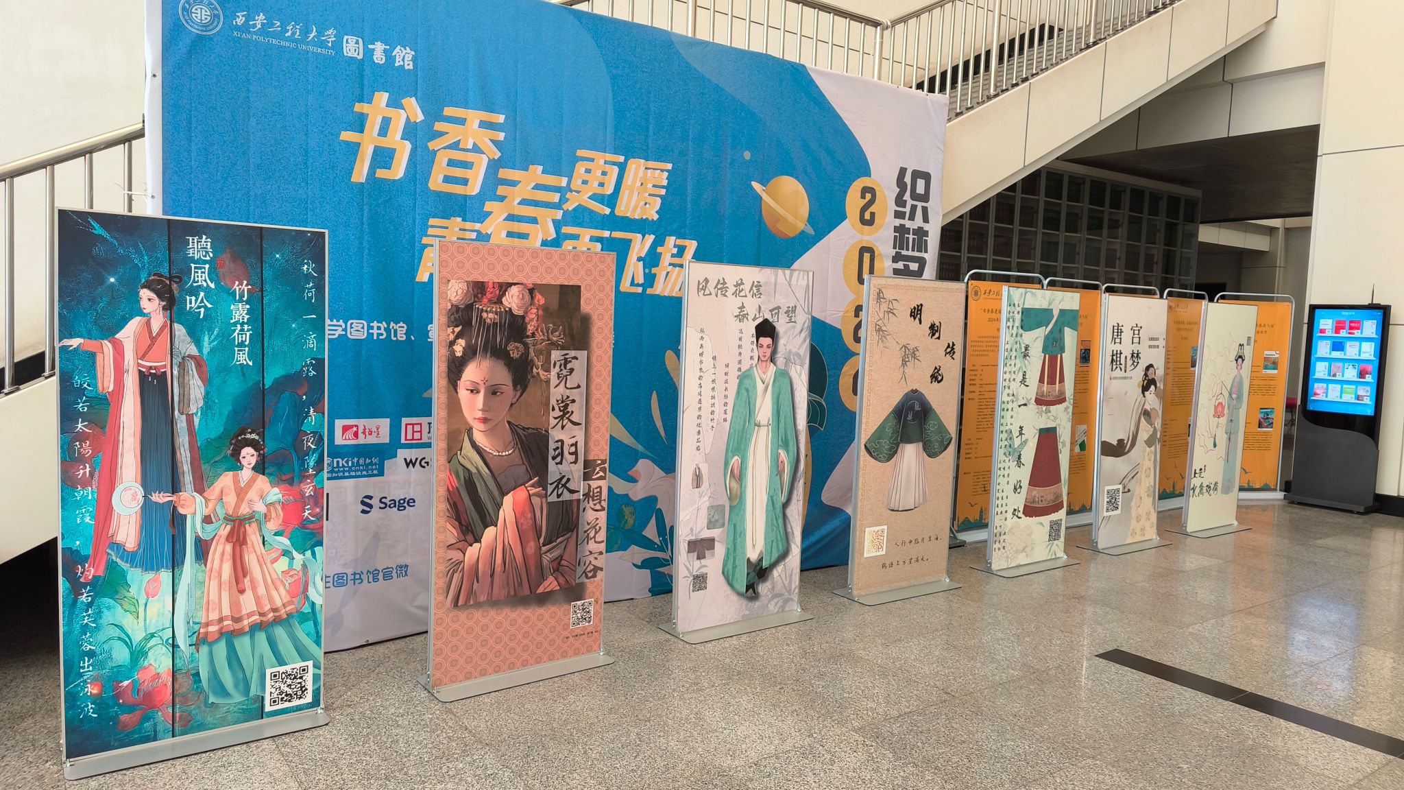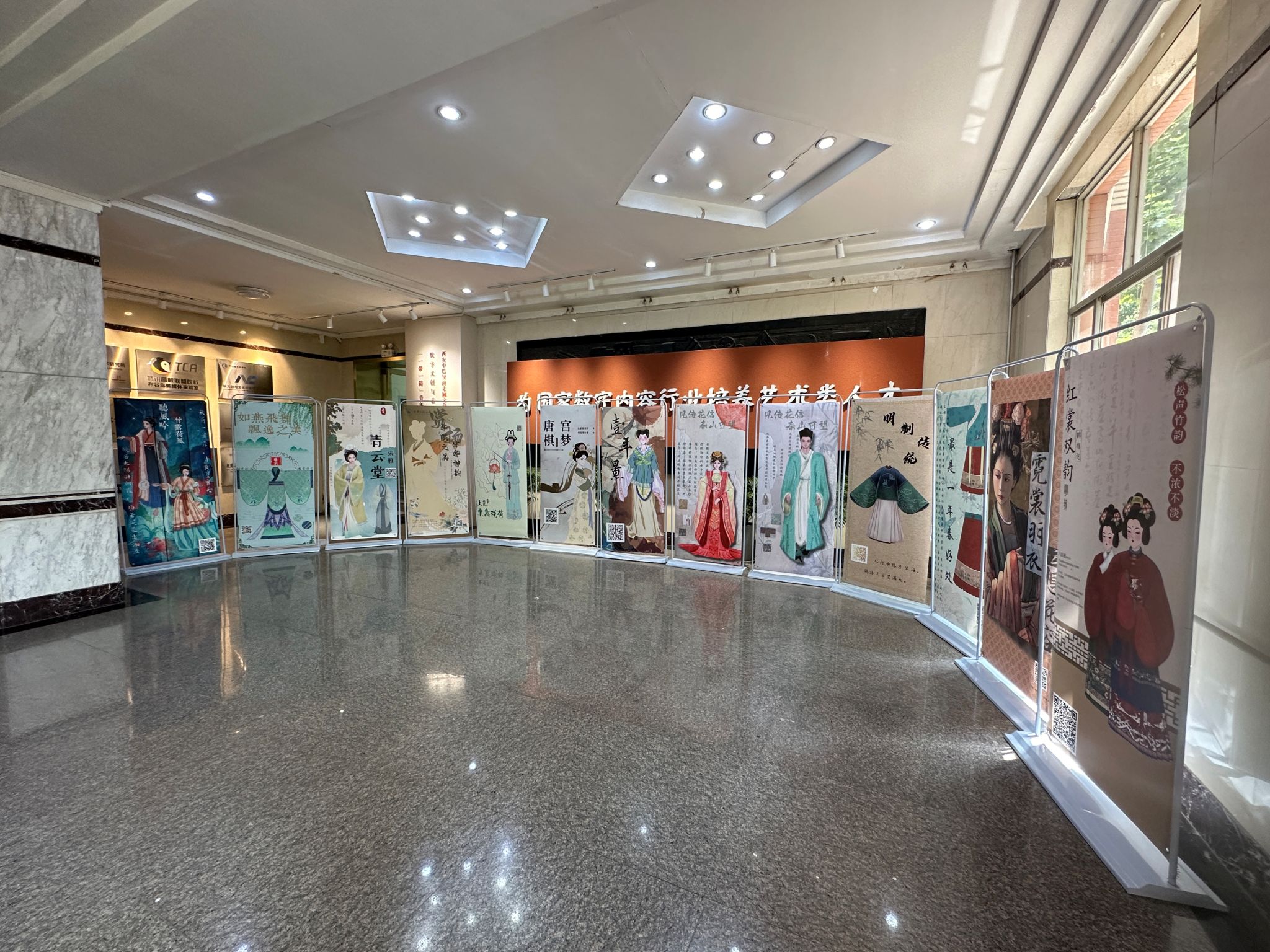 在校党委宣传部、汉服研究院的关心和支持下及91av 师生的共同努力下,“赏华服之美,扬中华神韵”汉服文化服饰展在91av 校园内隆重举行。服饰展分别在临潼校区图书馆一楼大厅、金花校区91av 大厅内进行展出。展览现场,一幅幅精美的汉服作品吸引了众多师生的目光。