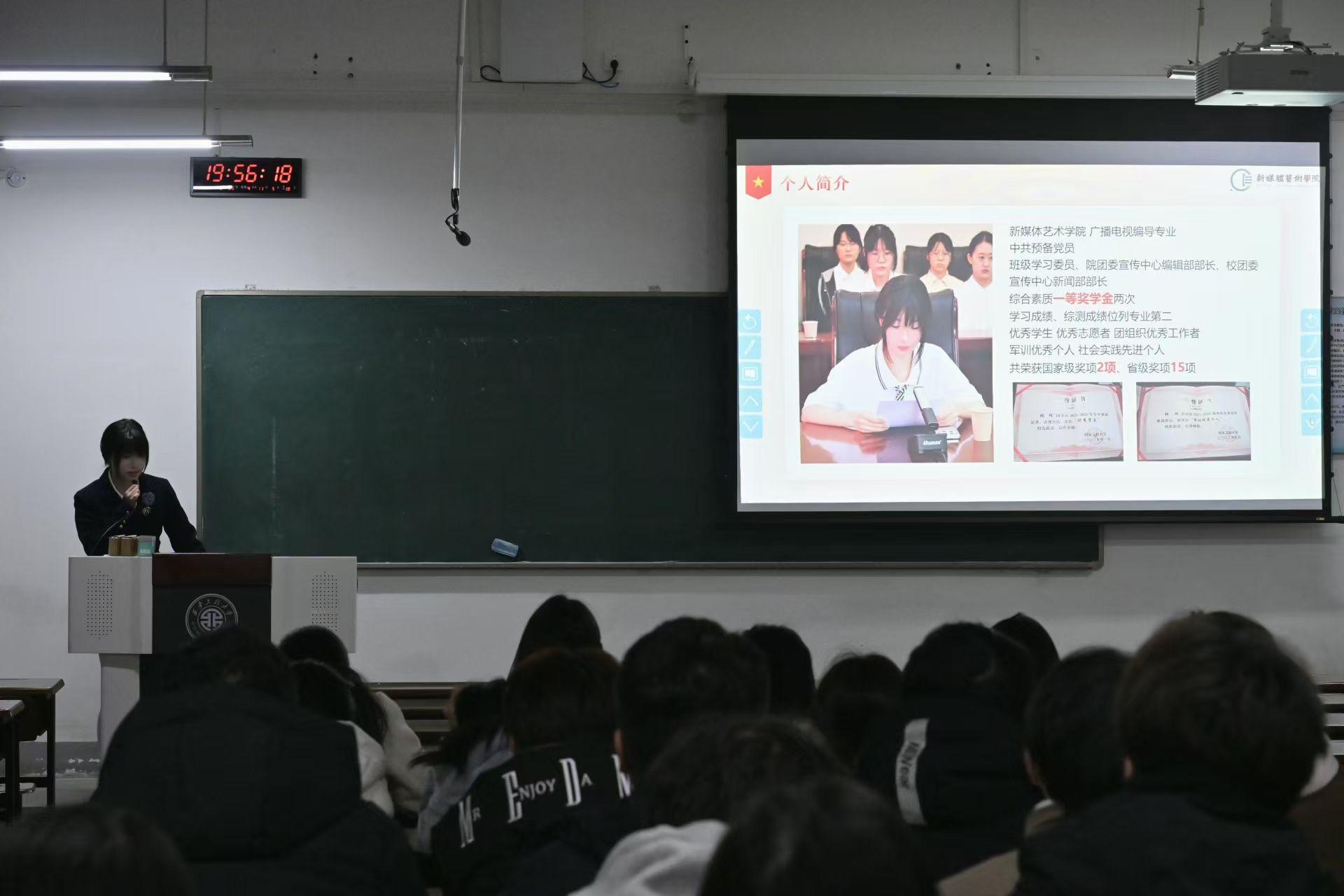 榜样引领成长,经验照亮前路。为进一步完善学生资助政策,发挥学院一站式学生社区作用,全面深化资助育人成效,充分发挥优秀学生的榜样示范作用,帮助低年级同学明确学习目标、掌握学习方法,助力学生全面发展。91av 于2024年12月5日19点在金花校区8号楼404教室成功开展“心有榜样,行有力量——感恩励志分享会(二)”活动。会议由卢瑶主持,优秀学生干部李宸鸣,优秀学生张靖进行分享,2024级广播电视编导专业全体同学参加。