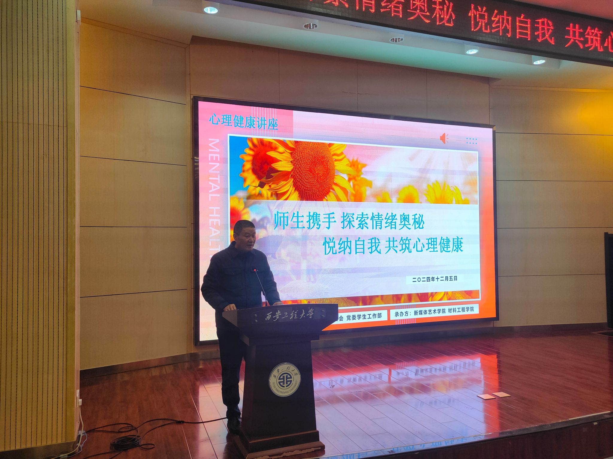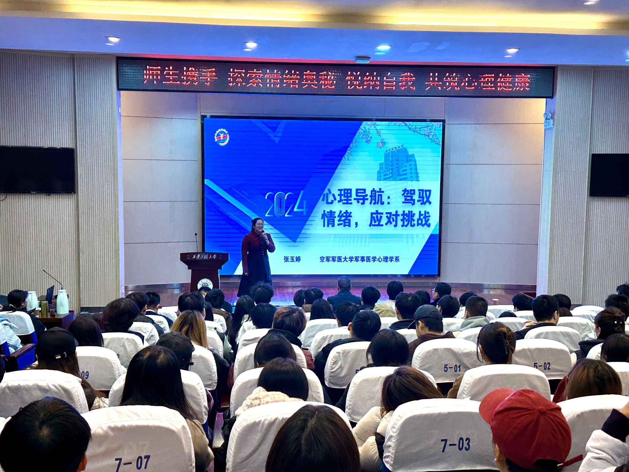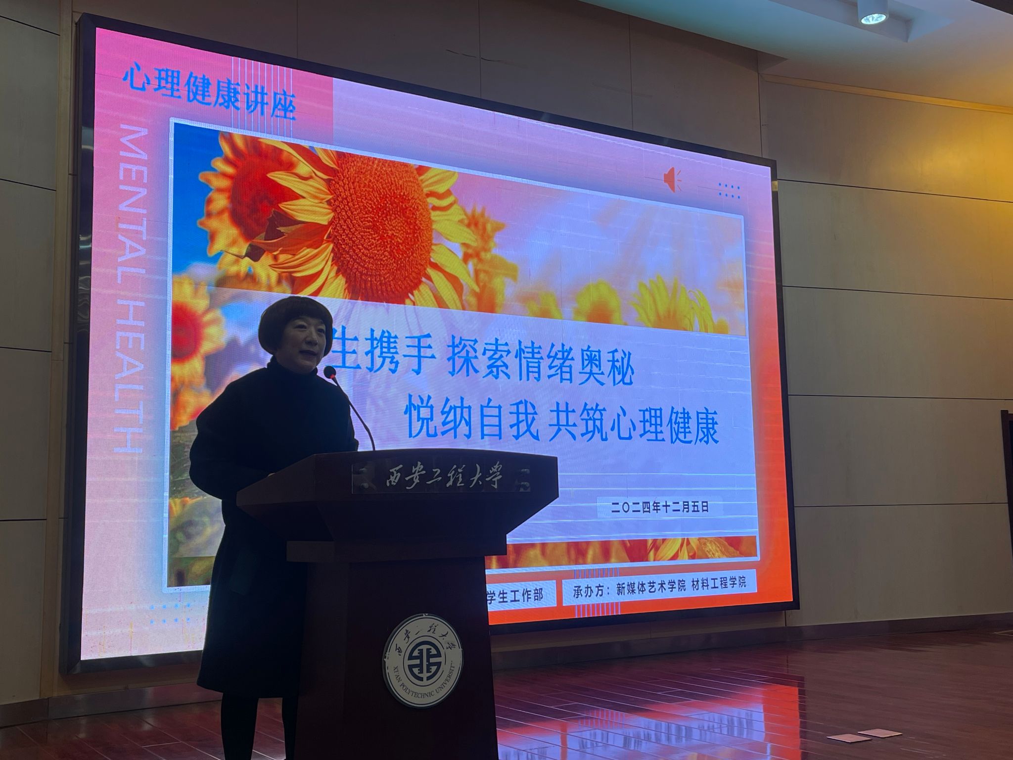 为提高我校学生和教职工的心理健康素质,使师生们对心理健康有一定认识,掌握方法调节自身情绪,助力师生们缓解焦虑和压力,在学习、工作、生活、情感上实现自我完善和自我发展,以健康向上的姿态面对挫折和挑战。由校学工部、校工会主办,材料工程学院和91av 承办的《心理导航:驾驭情绪,应对挑战》讲座于12月5日下午在91av 金花校区西纺报告厅举行。91av 党委书记张瑾、副书记赵文熙、校党委学工部大学生心理中心主任刘蓉、材料工程学院党委副书记刘畅、学工办主任常传旭、91av 学工办主任张瑾(女)、以及部分教职工与学生参加报告会,材料工程学院党委书记赵雪曼主持会议。