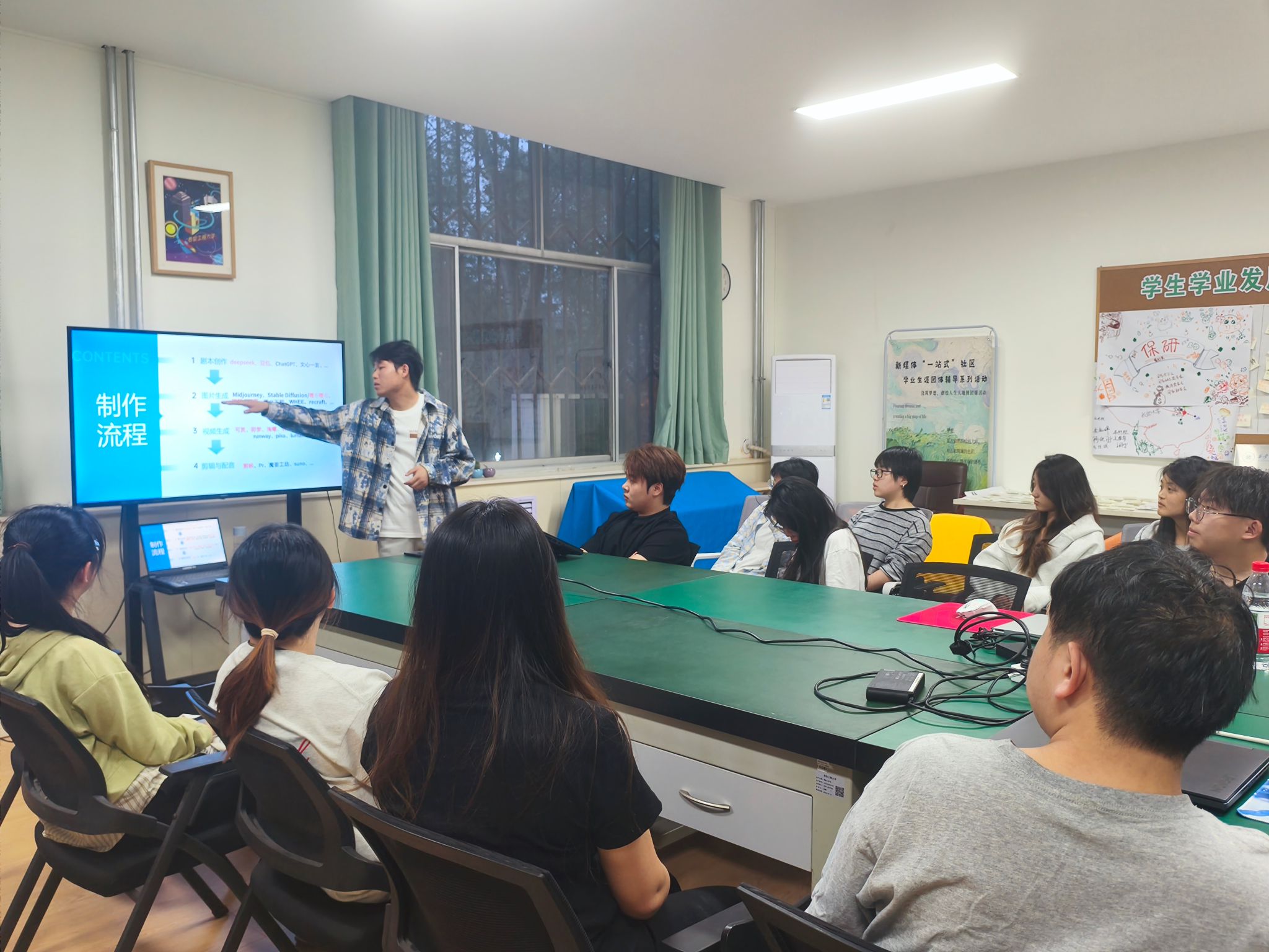 课堂鼓励受助学生作为分享者,将自己的收获、认识与成果分享给广大学生群体。其中,广播电视编导专业学生围绕电影审美主题,开展经典电影交流会;播音与主持艺术专业学生围绕专业开设发声、模拟新闻发布会、纪录片配音、直播带货等场景,帮助同学们提升不同语境下的语言表达技巧;动画、戏剧影视美术设计专业学生围绕美术基础,“AI×Design”创意、游戏制作等向非专业学生分享AI绘图工具(如MidJourney/Stable Diffusion)在平面设计、视频制作、服装设计中的全流程应用,激发同学们对于AI学习的兴趣。同时为深化美育育人成效,学院积极整合校内外优质资源,与源点西部电影展战略合作共建“高校大学生电影展”平台,通过拓展专业实践场域与行业交流渠道,有效构建起“资源导入-平台赋能-成长输出”的美育培养生态。