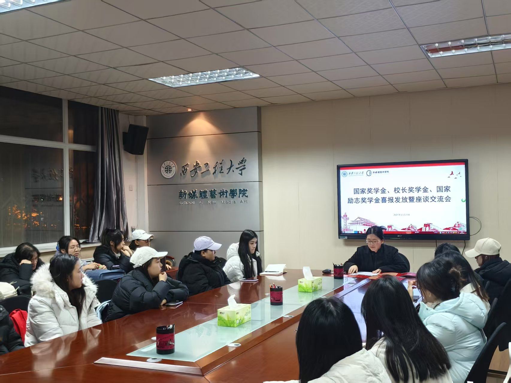 为发挥榜样示范引领作用,深化资助育人成效,2025年12月23日,91av 于金花校区8号楼326会议室举行国家奖学金、校长奖学金、国家励志奖学金喜报发放暨感恩励志教育座谈会。会议由资助辅导员宾田田老师主持,全体获奖学生参会。