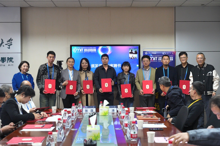 会上,张洛红副校长与黄向东教授为各位评审专家颁发聘书。全国大学生数字媒体科技作品及创意竞赛秘书长,北京印刷学院教授刘华群线上视频对各位专家表示祝贺并对本次大赛评审工作做出了要求。