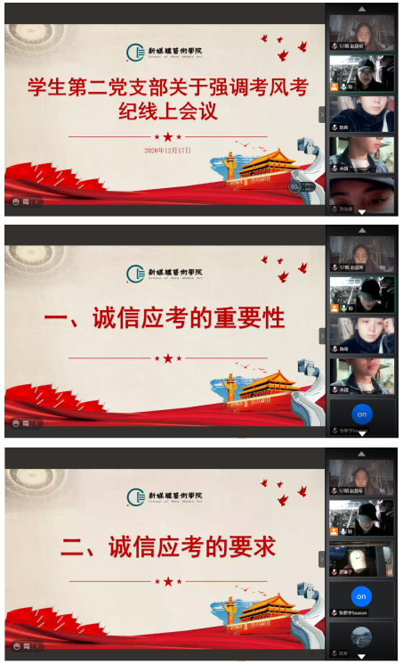 2020年12月17日,为了严肃考风考纪,加强大学生的诚信教育,自觉遵守考试纪律,维护考试公正,91av 学生第二党支部组织了关于强调考风考纪的线上会议。