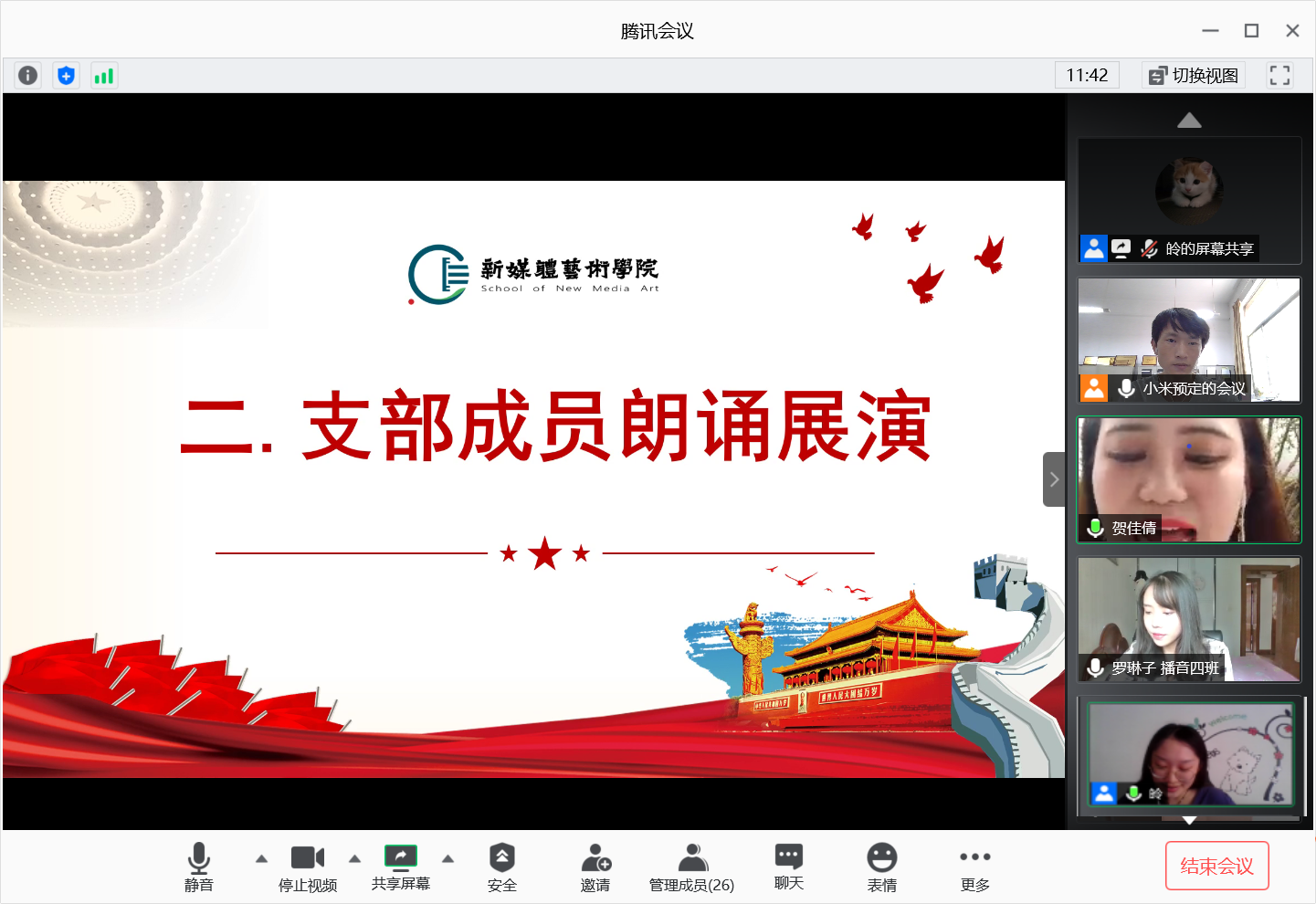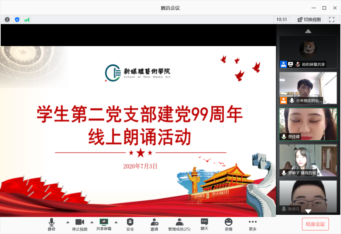 2020年7月3日,91av 学生第二党支部通过腾讯会议平台开展“建党99周年”线上主题朗诵活动,会议由支部书记刘东欢主持,支部全体党员参加了此次活动。