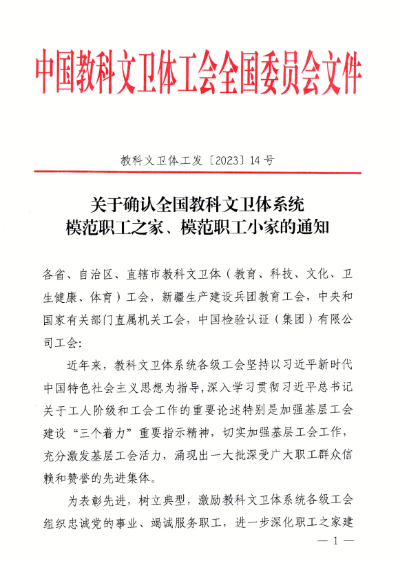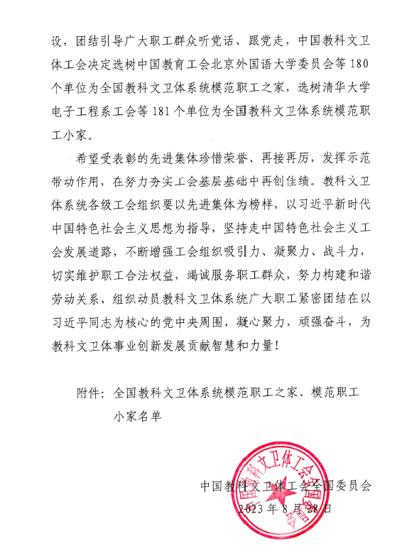 近日,中国教科文卫体工会全国委员会印发《关于确认全国教科文卫体系统模范职工之家、模范职工小家的通知》,我校91av 分工会被授予“全国教科文卫体系统模范职工小家”称号。