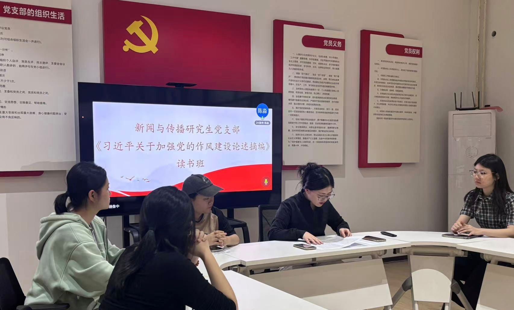 2025年4月23日,91av 新闻与传播研究生党支部举办首期读书班,深入学习贯彻中央八项规定精神,围绕专题学习《习近平总书记关于加强党的作风建设的重要论述摘编》。会议由党支部副书记宾田田领学,支部全体党员参加学习。
