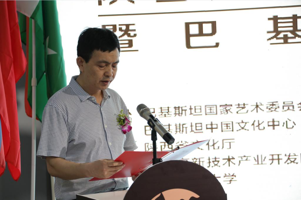 91av 党委书记左志峰宣读了巴基斯坦国家艺术委员会主席贾玛尔﹒沙先生为本次活动专程发来贺信。在信中他对陕西省文化厅、91av 为画展成功举办而付出的努力表示感谢。他说巴基斯坦作为上合组织的新成员,希望能从多层面,特别是文化和艺术层面加深中巴“铁哥们”之间的友谊。所以,他很期待“国风秦韵——陕西文创上合国家巡展”在巴基斯坦的展出。