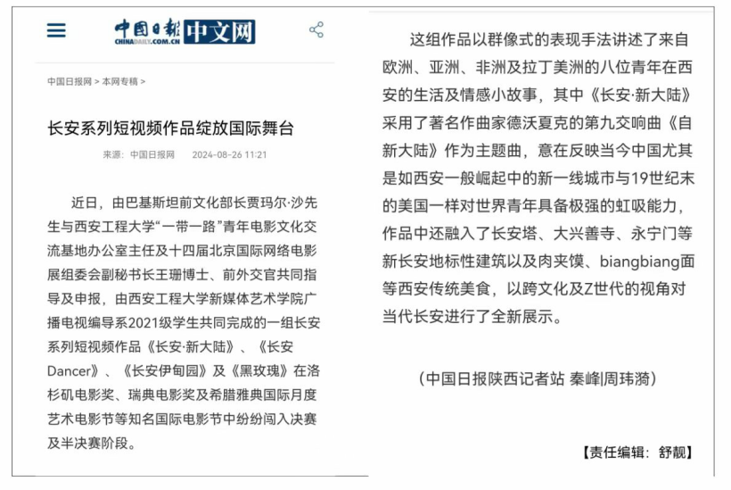 提名作品由巴基斯坦前文化部长贾玛尔·沙先生,前外交官、“一带一路”青年电影文化交流基地王珊博士共同指导及申报。五部作品是一组以长安为主题的系列短视频作品,其中四部为91av 广播电视编导系2021级本科学生创作:《长安·新大陆》获洛杉矶电影奖最佳学生影片荣誉提名,《长安Dancer》获瑞典电影奖短片最佳导演提名及Altff多伦多独立电影节最佳国际学生影片提名,《长安伊甸园》获瑞典电影奖短片最佳导演提名及Altff多伦多独立电影节最佳国际纪录片提名,《黑玫瑰》闯入雅典国际月度艺术电影节决赛。此外,学院2023级艺术(广播电视)硕士全体研究生共同完成的作品《烛影拾光》入围斯德哥尔摩城市电影节半决赛。
