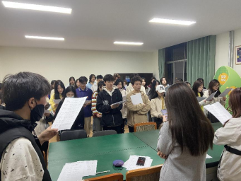 第一次排练学习了两首曲目:《歌唱祖国》和《光荣啊,共青团》,整体来说效果还不错,大家在学唱的过程中都非常认真,领唱的同学也很专业。因为团歌的高音部分较多,有很多同学都唱不上去,领唱同学就结合实际情况进行了降调处理,降调后的呈现效果更加适合大家,更好的调动起了同学们的积极性。