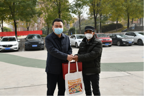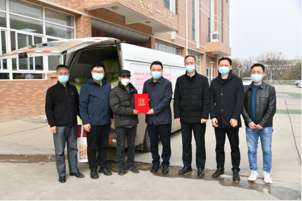 11月25日上午,我校91av 2020级动画4班晁嘉琦同学的家长晁小刚先生亲自将2000斤爱心蔬菜送至我校临潼校区综合楼餐厅,校党委副书记赵小峰代表学校接收捐赠并向晁小刚先生颁发了捐赠证书,赠送了纪念品。