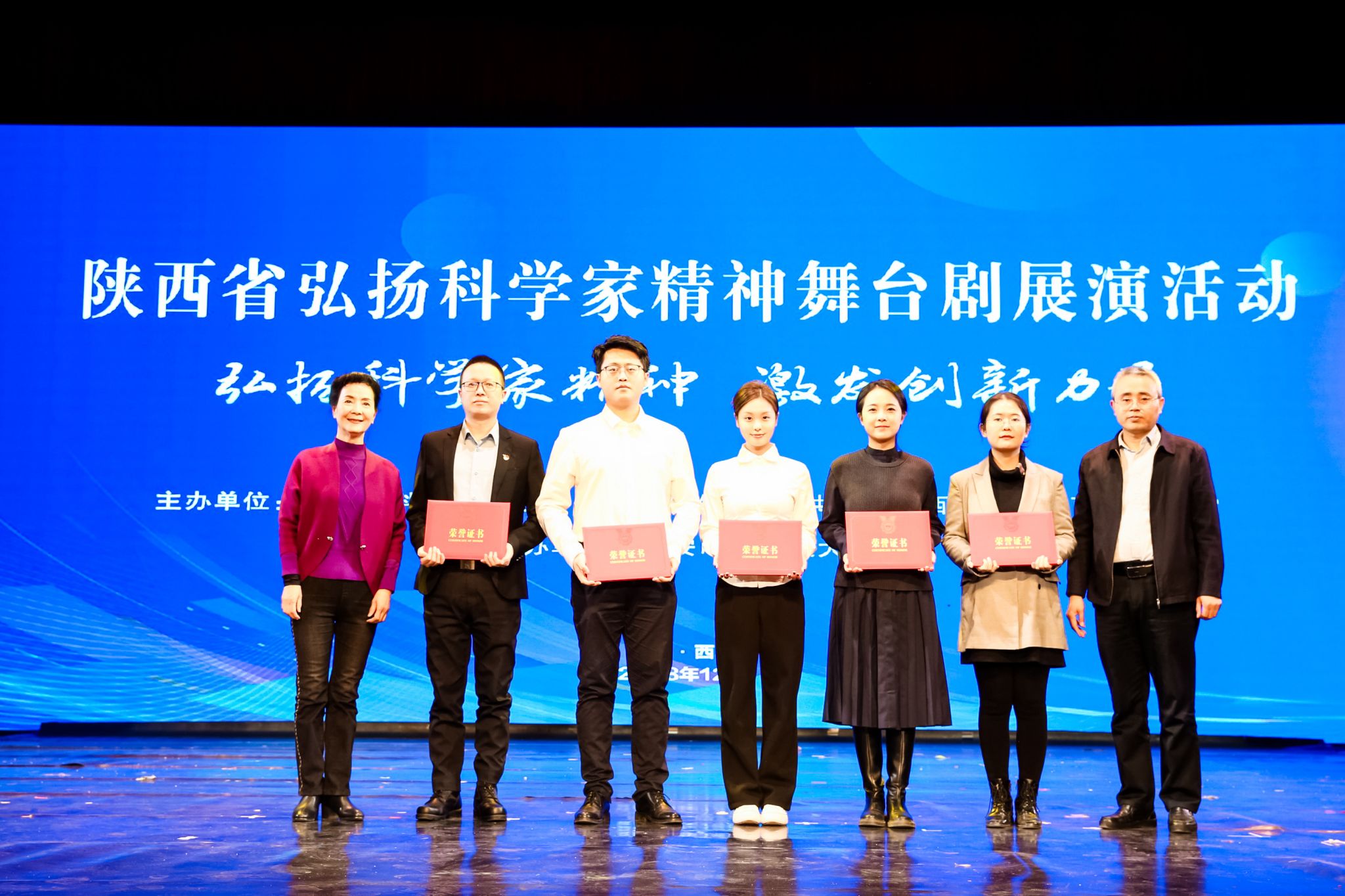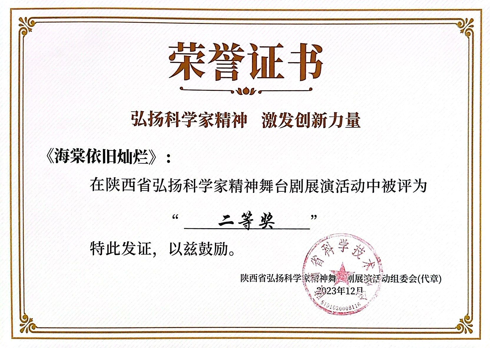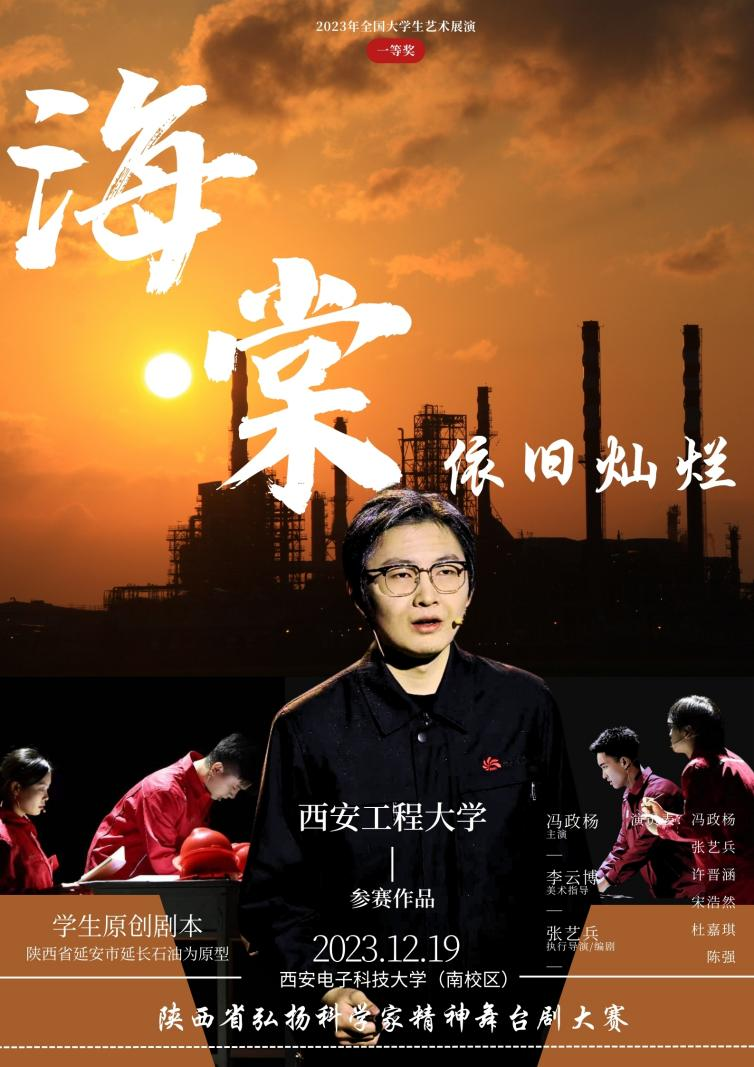 近日,省科协、省教育厅、团省委、省科学院共同组织开展的陕西省弘扬科学家精神舞台剧展演活动在西安电子科技大学南校区举行,由陕西实验话剧院演员赵翔,我校91av 教师林禹杉、张馨予共同指导的播音与主持艺术系本科生张艺兵原创话剧《海棠依旧灿烂》精彩亮相并荣获二等奖。