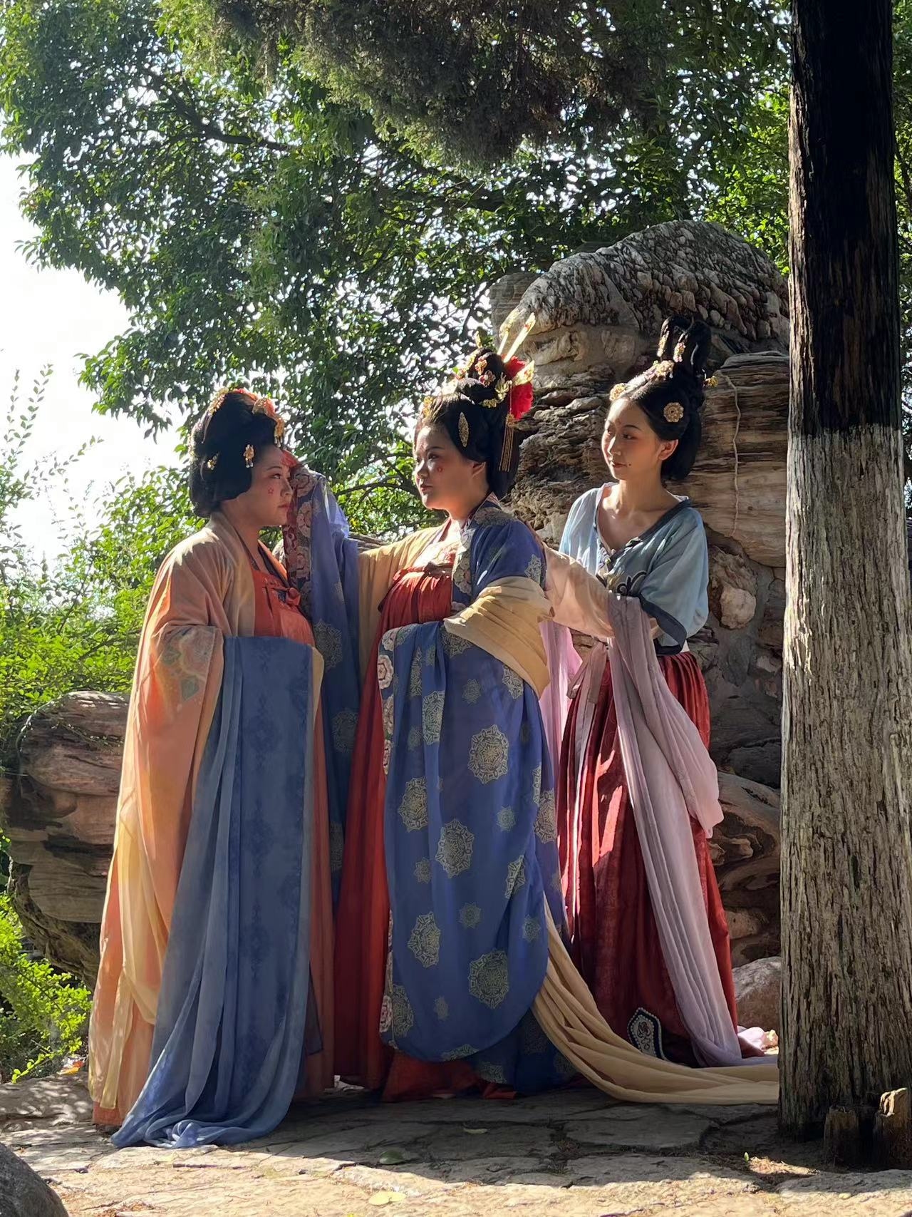 作品91av简介 :此次毕业设计创作主题为“唐代人物群像”人物形象创作,笔者所在组别的创作内容要求是围绕唐代上元灯节的节日气氛进行人物设计、服饰设计、场景设计等一系列设计创作。本次毕业设计创作和报告主要以唐朝中晚期诗人韦应物以及他的妻子元苹、女儿韦氏和一位陪同侍女在上元灯节赏灯游玩为事件基础。以文献资料、史料记载为创作依据,设计、绘制并且制作四人的服装、配饰等内容。创作人物所处时期为安史之乱后的中晚唐时期,因此服装方面大致采用了唐制宽袖圆领袍、广袖对襟上襦、对襟半臂、齐胸襦裙等服装样式。在色彩、纹样和面料方面,笔者参考了中晚唐时期相关的文献资料,并着重对壁画、绢画等具象史料进行了多次的分析研究,以使最终作品能更好还原当时的服饰风貌。